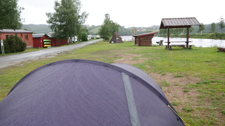 Da unser Zelt aus Norwegen stammt und der Firmensitz von Helsport keine 70 km Luftlinie von hier entfernt ist, traut es sich nicht einzuknicken. Gut so, aber der Test läuft noch, da wir uns entschieden haben das Zelt hier in Selbu noch für ein oder zwei Nächte stehen zu lassen und bei diesen Bedingungen nicht weiter zu radeln. Dies heute zu tun würde unsere Laune wahrscheinlich dauerhaft schädigen – einen Stresstest des Teams schenken wir uns deswegen für heute (wir stammen ja nicht aus Norwegen).