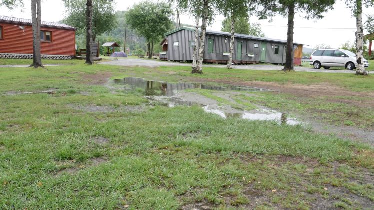 Auf dem Bild oben sieht man die Zeltwiese im Vordergrund – wir hatten gestern vorsorglich entschieden nicht dort zu zelten. Unser Zelt steht im Hintergrund auf einer Wiese neben dem Fluss.